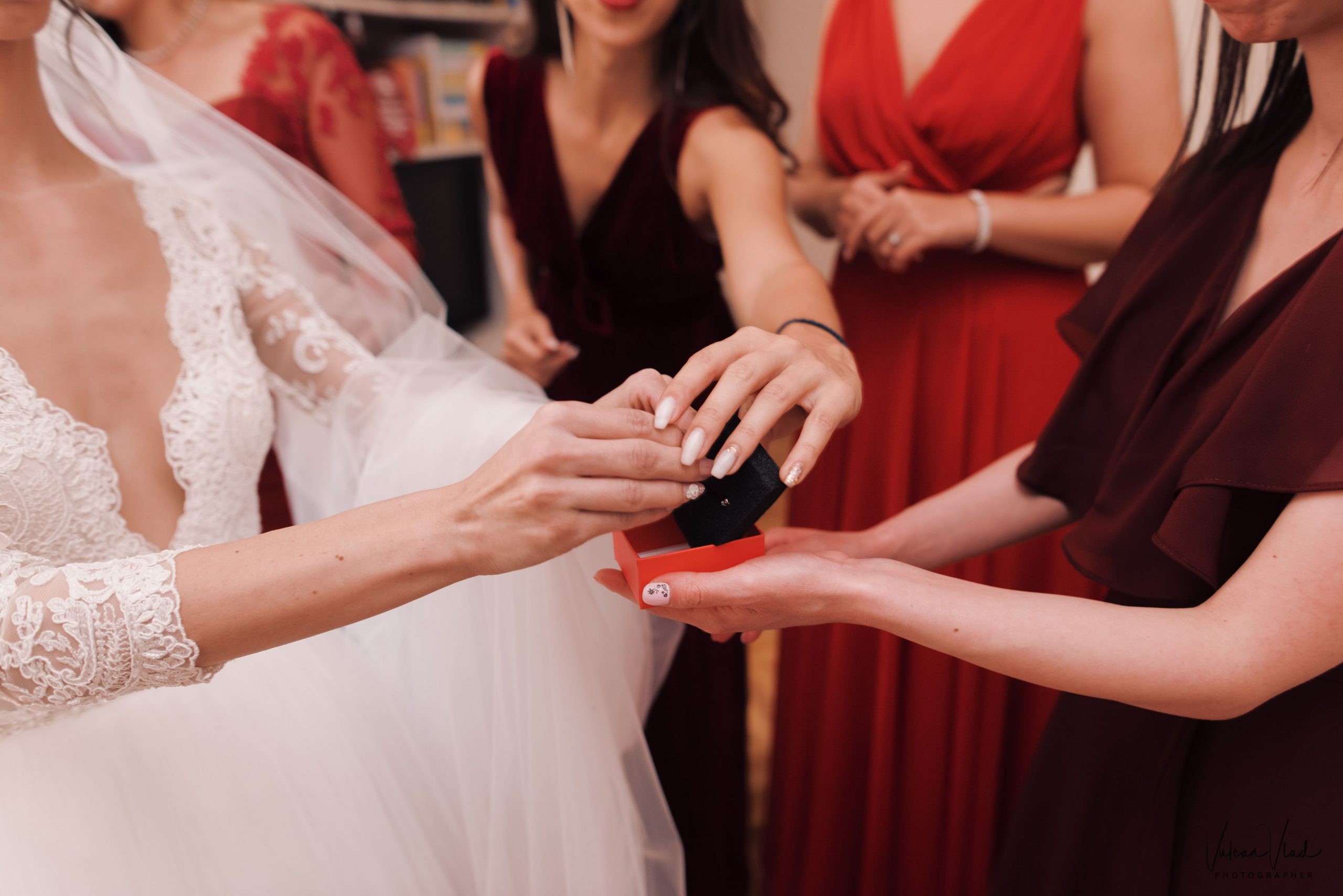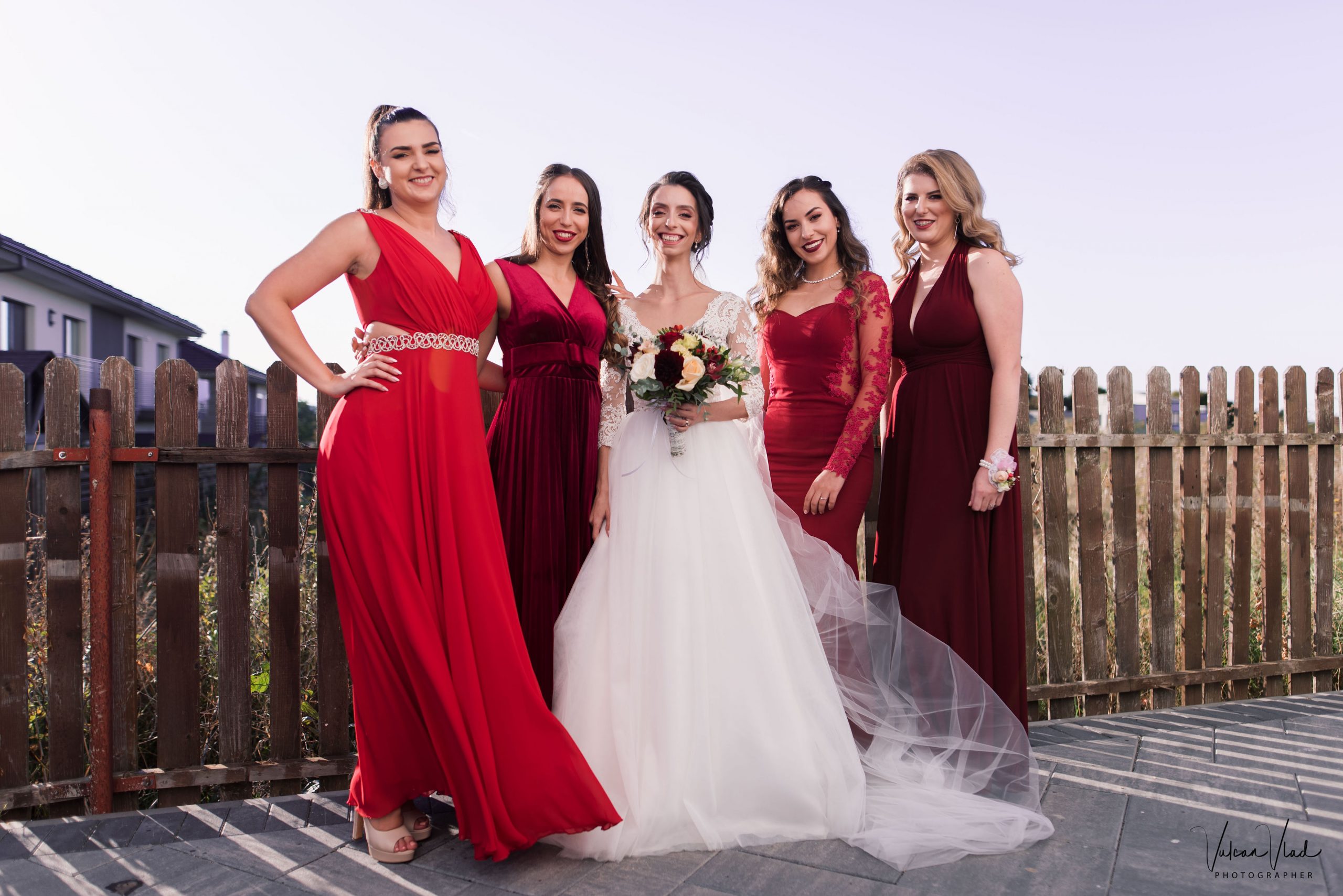 Domnișoarele de onoare asortate în culorile toamnei de un burgundy aprins, dar fiecare cu amprenta personala asupra tinutei, s-au completat de minune alături de Cătălina.